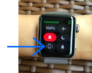 (文字盤を上向きにワン・フリックすると現れる画面。青の矢印のボタンをタップするとiPhoneを鳴らすことができます。画面左上にある「Connected」という緑の文字は近くにiPhoneがあるしるし)