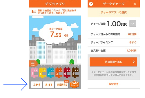 (デジラアプリの画面。「ふやす」で追加購入します。