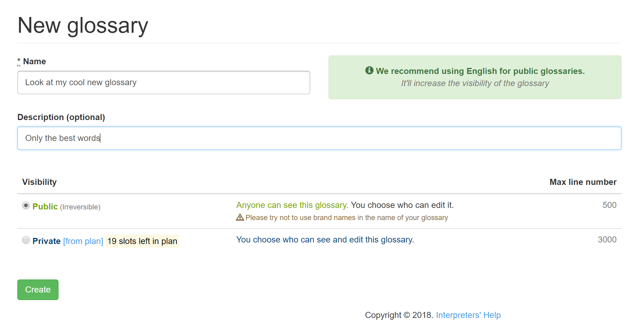 • When you set up a glossary, you can set it as private or public. A public glossary will be open for anyone to see.
