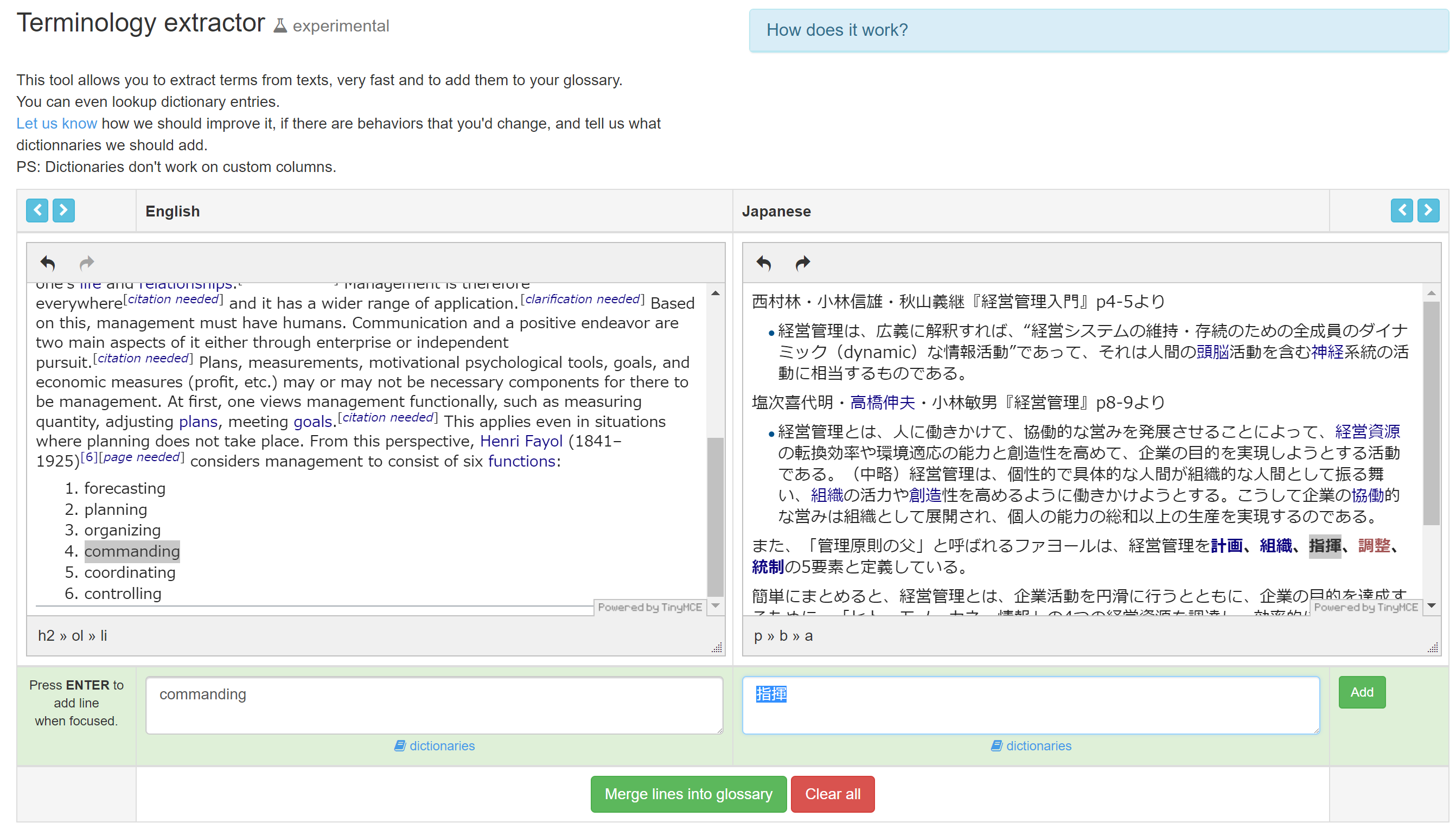 Imagine this: you are getting ready to interpret at a conference tomorrow. With less than 24 hours to go, the organizer sends you 100 pages of documents to help you prepare. Obviously, you can’t read them in detail, so you will need to find a shortcut. That is where Term Extraction comes in. It is a software that extracts words from a text based on their complexity and the frequency with which they occur in a document. There are many websites like this available, but I prefer to use Sketch Engine. You can upload the document to Sketch Engine and set the parameters for the kind of words you want it to find. Rare or common words? Multiple words that occur together or single words? Proper names, acronyms, or just nouns? How many repetitions before it shows up on the list? Once you input those settings, it will look through the entire document and provide you with all the applicable words in a CSV file. From there, you can build your glossary as you normally would. Let’s take a look.