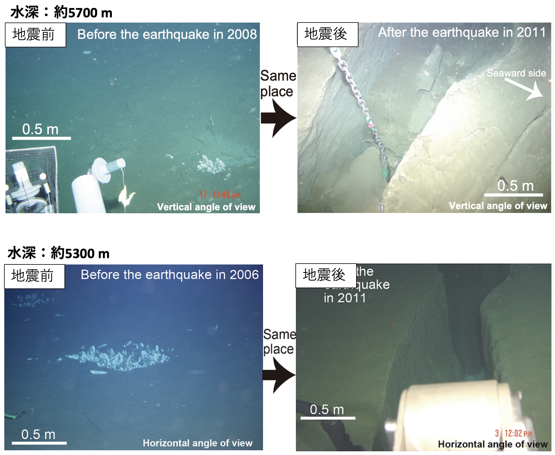 図2.地震前後で同じ場所で撮影した海底面の写真(Tsuji et al., 2013)。地震前は、シロウリガイがいて平和な環境であったが、地震直後は亀裂が発達し、シロウリガイはみられない。
