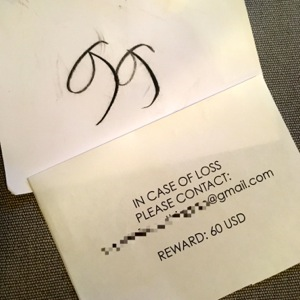 海外出張中にこのポーチをどこかに忘れたりした時のために、こう書いた紙切れを入れています。謝礼にどれだけの効果があるのかは分かりません。