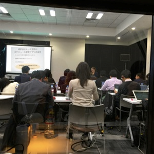 IT系「製品トレーニング」の一コマです。販売代理店や社内の営業員を対象に、講義や実習を通じてソフトウェアや機器の特徴や操作法を学んでもらい拡販につなげよう、という活動ですね(個人が特定できないようモザイクをかけております。スクリーンに投影されているように見えるのは、私が過去に行ったガジェットに関する講演のスライドをはめ込んだものです)。