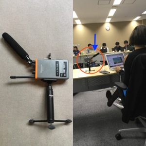 こんなふうに組み合わせて使います。ホルダーはスマホ用のものですが、これがパナのサイズにぴったりなのです。机に直に置いても十分音は取れますが、このように少し高さを持たせることで、より優れた音質が期待できます。自分の前に置けばマイクスタンドにもなります。