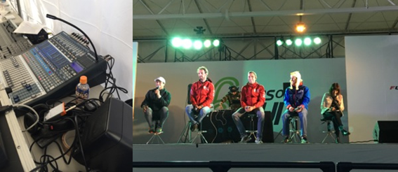 モータースポーツのイベントで通訳する筆者。これならエンジン音やDJのBGMも怖くない?!