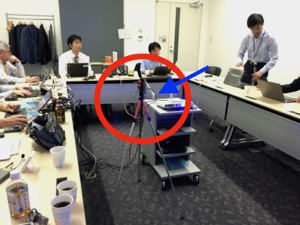 こんな風にマイクを直立させて会議室の中心に置くことで、全員の声を拾ってくれます。頻繁に話す人や声の小さな人に向けてわずかに傾けるとより効果的。話し手の真ん前に置くよりは多少聞きづらくなりますが、それでも同時通訳に十分耐えうるクオリティです。
