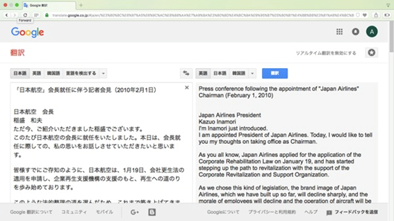 Google翻訳に話を戻します。翻訳結果を見てみると、ところどころ微妙におかしなところや間違いはありますが…うーむ、誤解を恐れずに言わせていただくなら、もしこれが資料や打ち合わせなしのぶっつけ本番の同時通訳だったなら十分合格レベルなんじゃないでしょうか(笑)。「そこそこ使える」なんて上から目線でスミマセンでした。