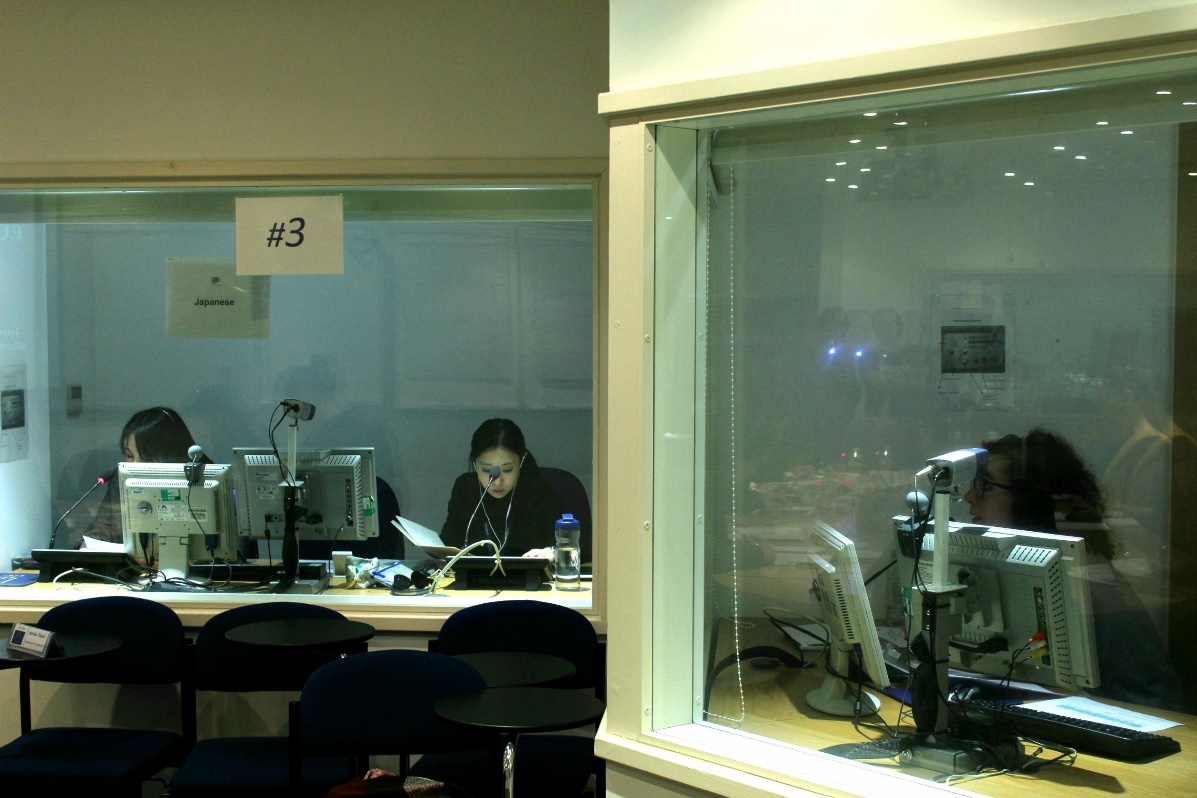 その名の通り、欧州連合(EU)と国際連合(UN)の内容に特化したモジュールです。モジュールの中心は全4回の模擬会議(第5週、第7週、第9週、第11週に行われる)で、他にはEUについて6回、UNについて6回、それぞれの組織の仕組みや歴史などについての知識を深めるためのワークショップがあります。さらに、言語別のチュートリアルセッションも4回行われ、4回の模擬会議に備えて知識を強化したり、言語に特化した通訳練習を行ったりします。模擬会議はEUの本会議だったりUNの総会を模した内容や設定になっており、模擬会議のスピーカーはそうした実際の会議に出席しているような人になり切って参加します。言語はB言語からA言語のみですので、私にとっては英語から日本語のみです。逐次通訳、同時通訳両方扱っています。