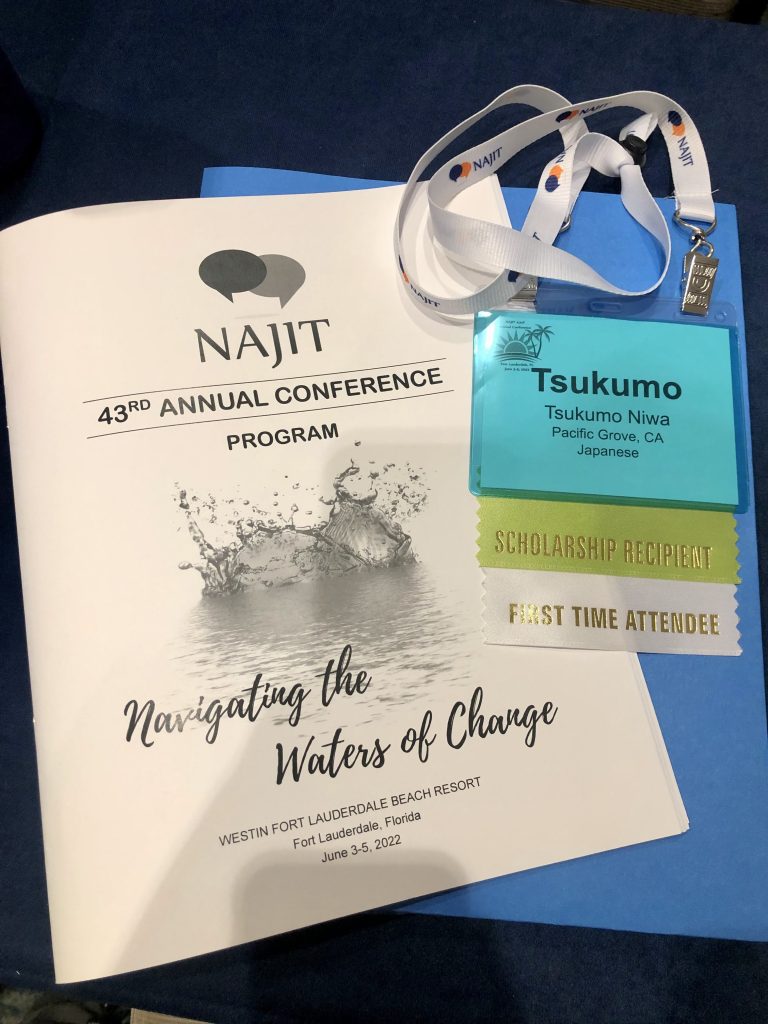 仕事を始めた以外にも、いくつか貴重な経験をさせていただきました。まず、2022年6月には、フロリダ州で行われた全米法廷通訳翻訳者協会 (NAJIT)の年次会合に、奨学金を受け取って参加することができました。毎年5人ほどが選ばれるこの奨学金プログラムの授与者は、会合前日の夜から法廷通訳翻訳界の「大御所」たちの集まるレセプションやディナーに誘われ、会合中も様々な言語のメンターや先輩通訳者たちが目をかけてくれるという、とても贅沢な環境で多くを吸収できます。コロナ禍が始まって以来初めて対面のカンファレンスに参加したのですが、やっぱり対面に代えられない部分はあるな・・・と実感しています。