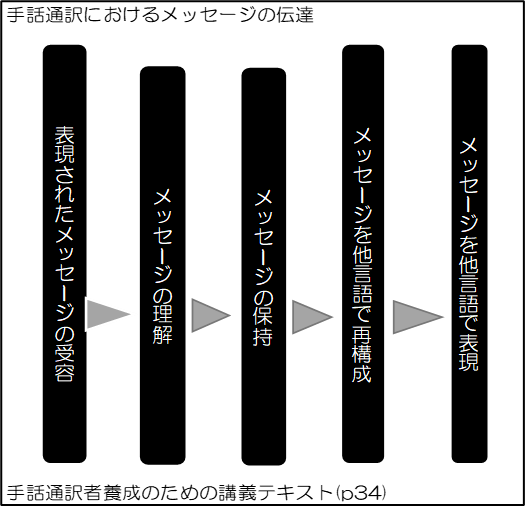 「ろう者の期待」(手話通訳の利用者の意)に応える「手話通訳のやり方」が評価されるのは手話通訳のプロセスの最後の表現にあるのですが、適切なメッセージの理解と再構成があって初めて表現となることは言うまでもありません。発言者の意図、発言の意味、メッセージの理解があって、それを意味にあった適切な音声日本語又は手話日本語で表すのです。