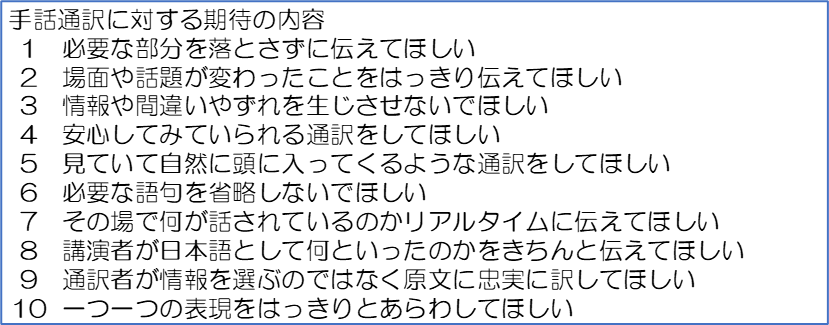林智樹さんは、社会福祉法人全国手話研修センター発行「手話通訳者・手話通訳士ハンドブック」のP47で、白澤麻弓さん(一般社団法人日本手話通訳士協会理事)の「日本語-手話同時通訳の評価に関する研究」からろう者の手話通訳に対する期待を右のように紹介しています。