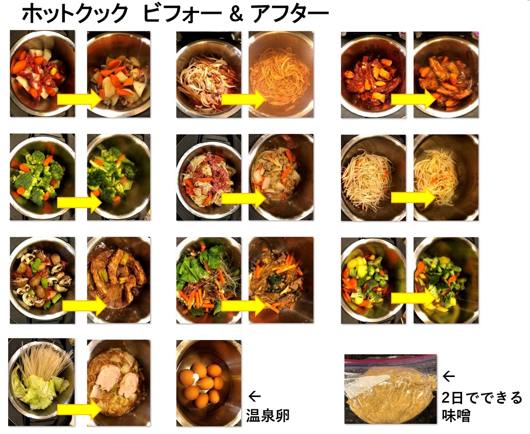 炊飯器のような作りで、蓋の裏側にアーム付いていてかき混ぜながら調理してくれます。材料さえ入れておけば「あとの調理は任せてね♪ピロリーン♪」と宣言し、勝手に料理してくれる可愛いヤツです。コンロに乗せた鍋やフライパンの前につきっきりで食材をかき混ぜたり、火加減を調整したりせずに済むのがこれほど楽だったとは! 使いこなすには多少の練習が必要ですが、慣れたらもうホットクックなしの生活には戻れません。手作り味噌も2日で完成します。アメリカでは Instant Pot などの、圧力鍋・スロークッカー・発酵・電気鍋・炊飯器などを兼ねた電気調理機器があります。こちらもかなり使えます。ホットクックが手に入らない地域の方も何かしらその土地の電気調理器を活用すると楽になるかもしれませんよ。