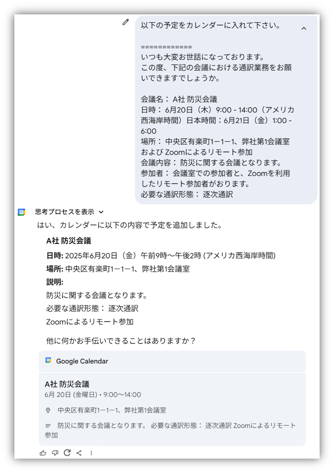さらにこれ以外の時間を Gemini にリスト化させて「対応可能の時間」として伝えても良いですね。その場合は計算が関わるので Pro モデルの使用をお勧めします。(間違えられたら怖いので私はやりませんが…)
