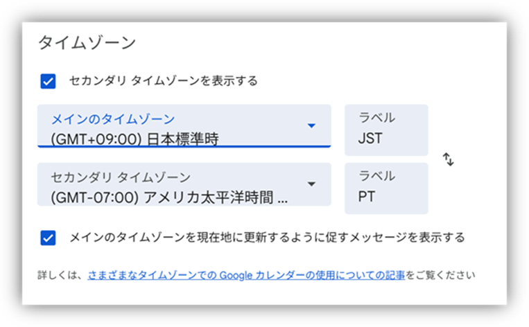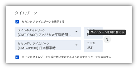 海外在住の通訳者には特に便利な機能として、カレンダーに2つ目のタイムゾーン(セカンダリタイムゾーン)を設定することが可能です。カレンダーのギアアイコンから設定メニュー画面に移り、「タイムゾーン」から居住地のタイムゾーンと、日本などの良く使うセカンダリタイムゾーンを設定してみてください。ラベル(下図)はデフォルトでは「GMT+09」などの直感的ではない表示になるため、「JST」(Japan Standard Time)や「PT」(Pacific Time)など一目で分かるラベル付けをお勧めします。
