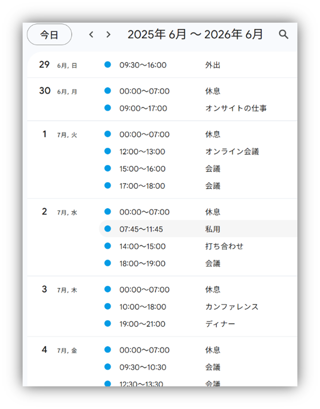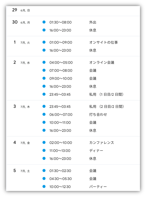 ちなみに、この例では睡眠時間を「休息」として一時的に毎日繰り返しの予定に含めています。異なるタイムゾーンの相手の時間に変換しても、対応不可の時間として伝えられるからです。ただし、カレンダーに常に睡眠時間が表示されると邪魔に感じるので、リストを作り終えたら削除した方がスッキリするかと思います。