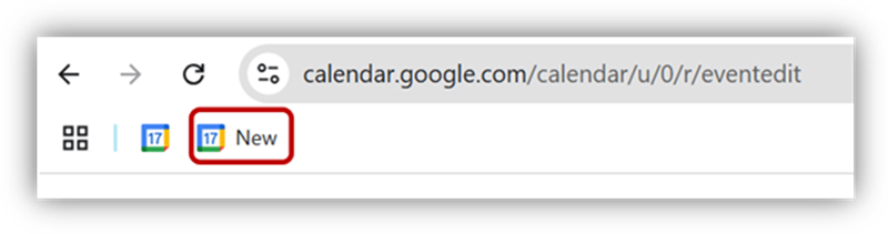 カレンダーを表示していなくても、URLに “cal.new”と入力すると、先にカレンダーを開く必要なく新規予定を作成できます。タイプが苦にならない短さですが、私はブラウザのブックマークに「新規予定作成用」のブックマーク(下図の赤枠)を置いてクリックするだけで済むようにしています。ちなみに赤枠の左隣のアイコンはカレンダーを開くためのブックマークです。