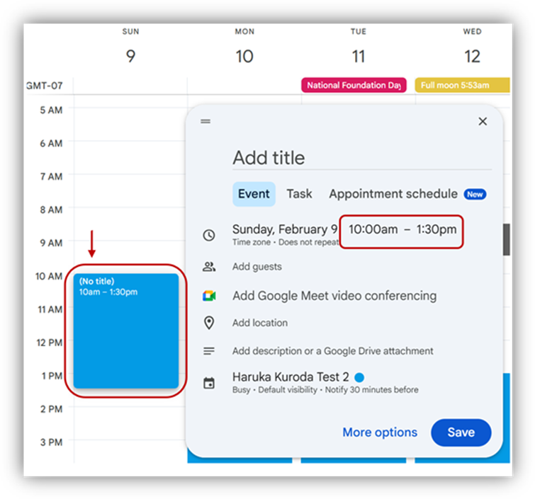予定を入れる日の開始時間(下図矢印の下あたり)をクリックし、終了時間までドラッグしてください。(下図では左の赤枠内10:00 AM をクリックし 1:30 PM までドラッグ) すると、予定に自動的にその時間を入れてくれる(下図の右の赤枠内)ため、予定作成の時間を入力する手間が省けます。設定できるのは15分きざみです。