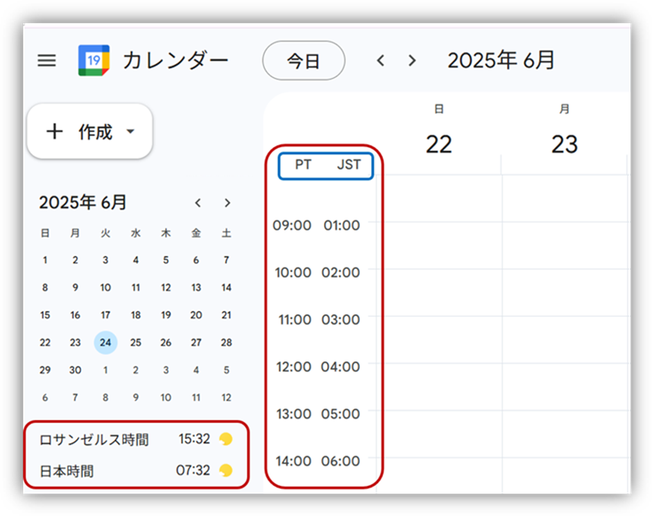 異なるタイムゾーンの予定をクリックで入力する際も、正しい時間を確認できるようになります。また、両タイムゾーンでの現在の時刻も表示されます。(左下赤枠)