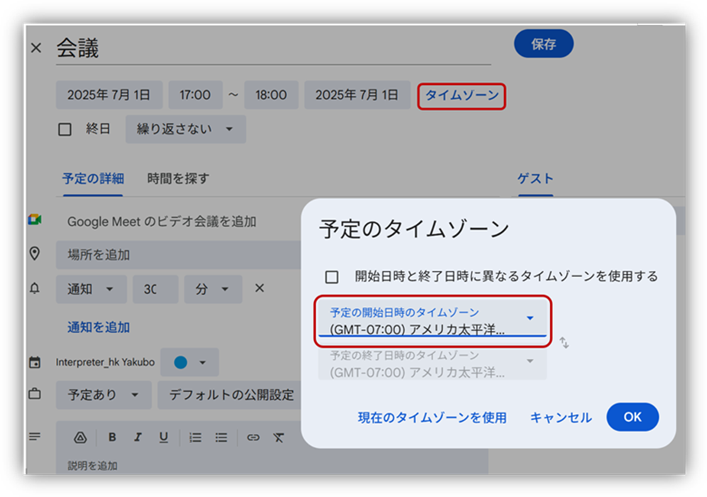 例えば日本在住の通訳者に「7月1日のアメリカ太平洋時間(西海岸時間)17時~18時の会議」など、異なるタイムゾーンの会議の打診があったとします。その場合は、頭の中で日本時間に変換しても良いのですが、とりあえず「7月1日17時~18時」でカレンダー予定を作成し、「タイムゾーン」のドロップダウンリストから「アメリカ太平洋時間」を選択して予定を保存してみてください。