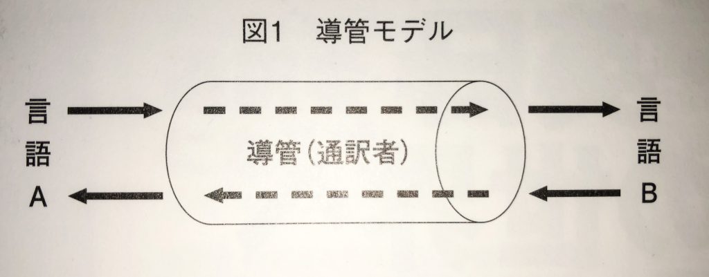それにも関わらず、通訳者が「そのまま訳す」ことが可能だとする考え方の背景には、「導管(conduit)モデル」と呼ばれるコミュニケーションモデルがあります。言語学者マイケル・レディが1979年にその原型となる考え方を示したもので、図1に示されているように、情報の送り手がAという言語で話した内容が、そのままパイプのような管(=通訳者)を通る過程で元の意味を完全に保持しながら言語変換され、Bという言語で受け手に届く、というイメージです。