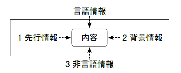 例えば、実際のコミュニケーションで I will be there tomorrow. という言葉を理解するためには、I、there、tomorrow の内容を具体的にとらえる必要があります。そのためには、話者、場所、時間など、その言葉が使われた状況に関する情報が不可欠です。これらはすべて非言語情報ですが、こうした情報もすべて文脈に含まれます。さらに、われわれが生きていく中で身につけたさまざまな常識や想定もすべて文脈となる可能性があります。